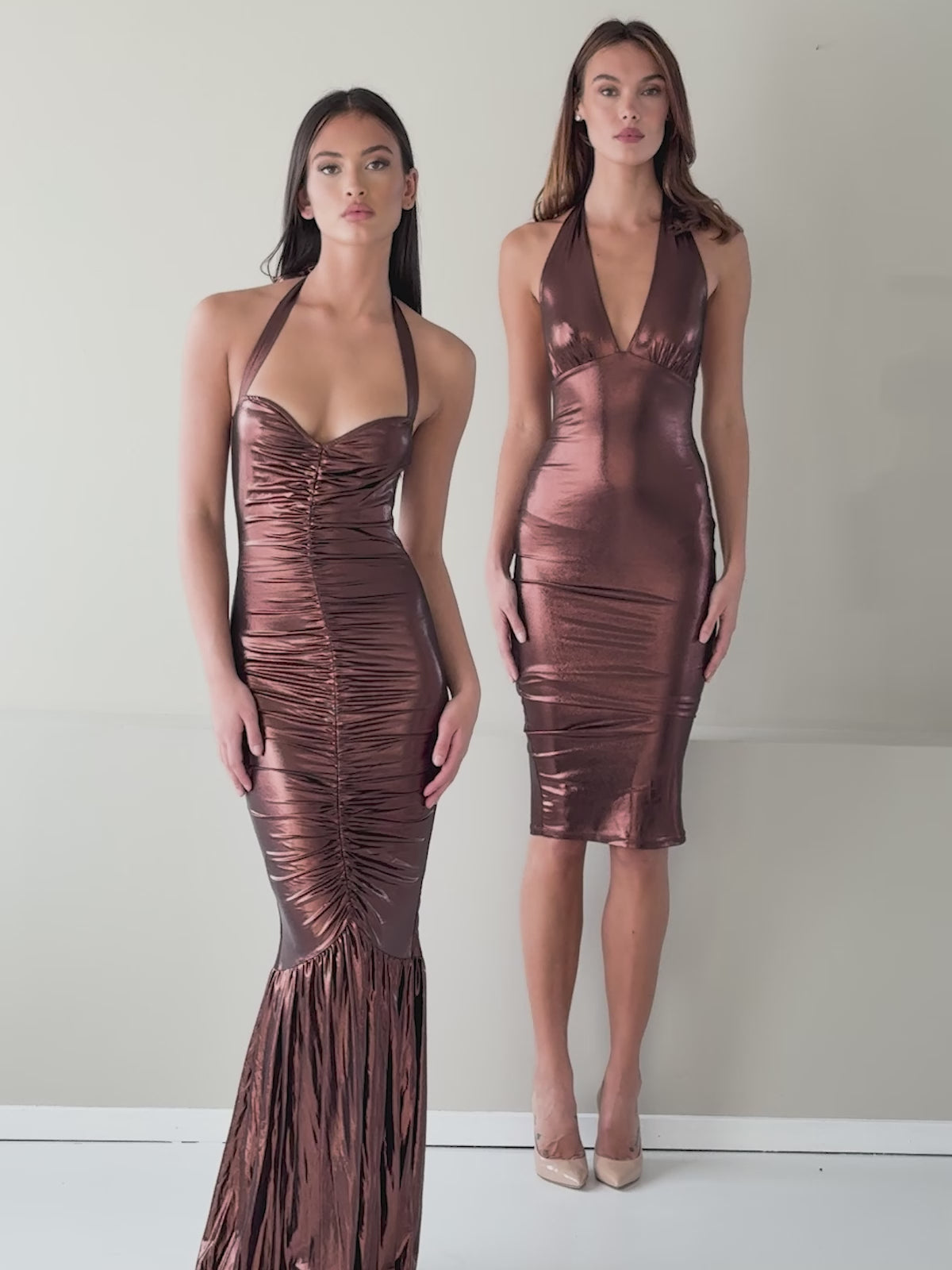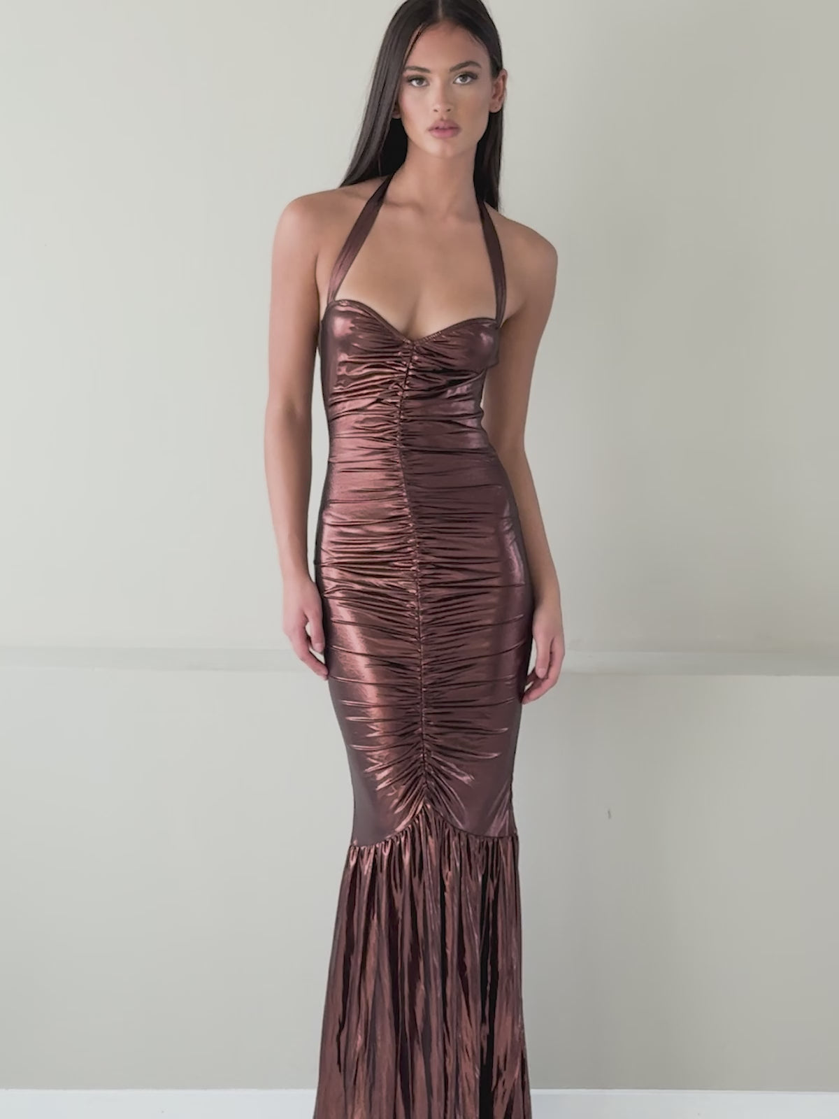 This bronze beauty hugs my body in all the right ways, with a shine that catches every light. She’s made for golden hour moments. The ultimate feminine silhouette that flatters soft and bold at the same time. Elegant, radiant, and made to steal the night.