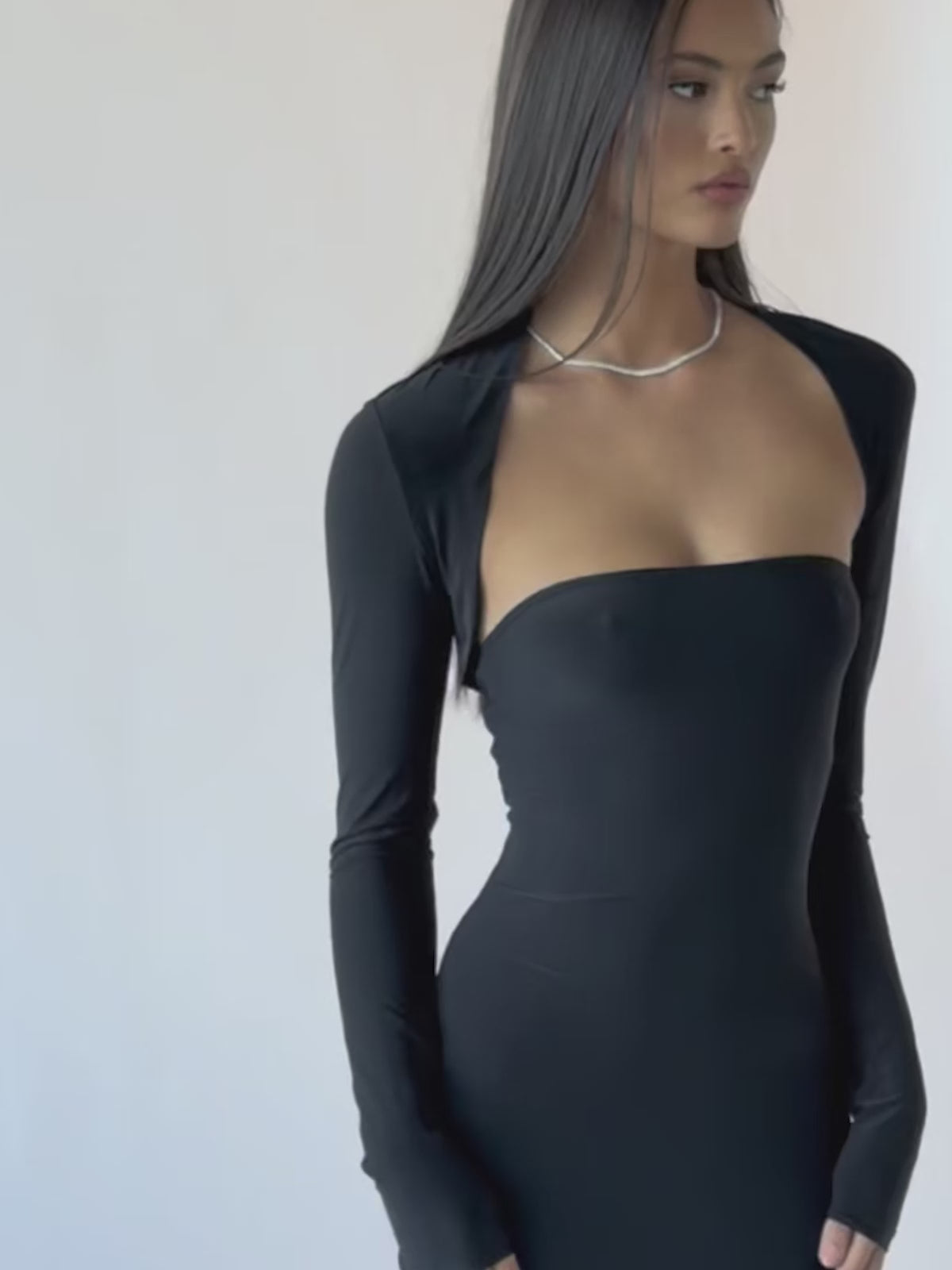 Classic, but with a twist. The off-shoulder neckline frames the body beautifully, and the snatched fit sculpts every curve to perfection. Tied in the back with extra-long straps for that luxurious touch. I wear her with voluminous curls, glowing makeup, and high heels.Sophisticated, sultry, and absolutely timeless.